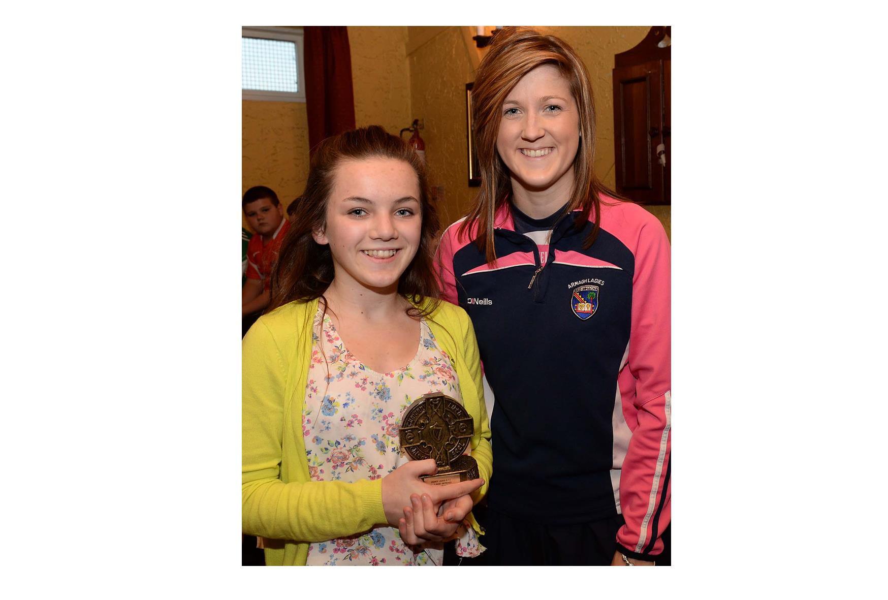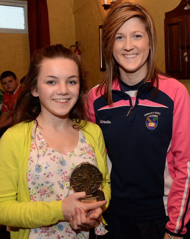 Grange Under 16 girls most improved player of the year, Clonmore girl Emma Conlon, receiving her award from Siobhan Mackle – Armagh Senior ladies player at the recent presentation ceremony.
